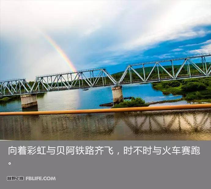 晚些时候飘起了小雨,反而没有前车的拉起来的烟,让我们的车速也有些提升。疲惫了一天的身躯让兄弟们有些抱怨,但雨后天晴的双彩虹在西伯利亚的天空上搭起了“桥梁”,让队员们兴奋了好一阵。向着彩虹与贝阿铁路齐飞,时不时与火车赛跑,